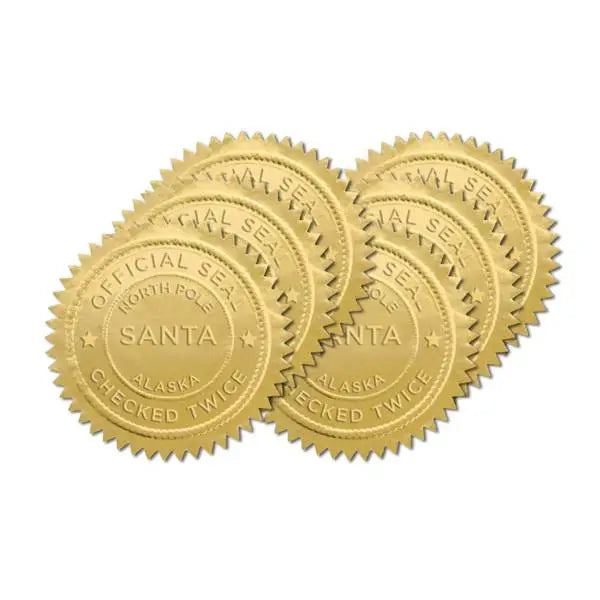 Our Santa Seals are embossed and die cut by “elves”, and come protected in a clear plastic box only after being checked twice by “the big guy”. Just peel and stick. You will receive six seals for all of your North Pole correspondence.